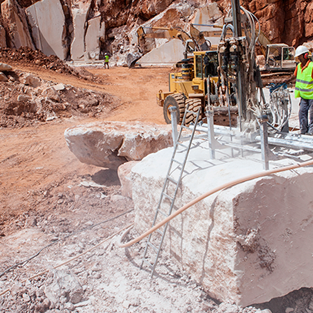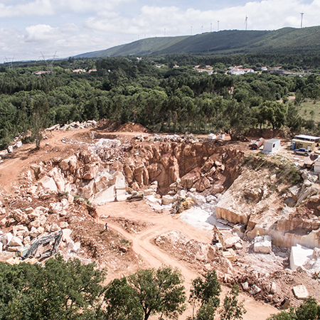 Todo o processo começa com a extração dos blocos na pedreira, é aqui realizado o primeiro controlo. A classificação dos materiais por qualidade, quantidade existente e caracterização técnica permite garantir, a cada projecto, uma solução viável.