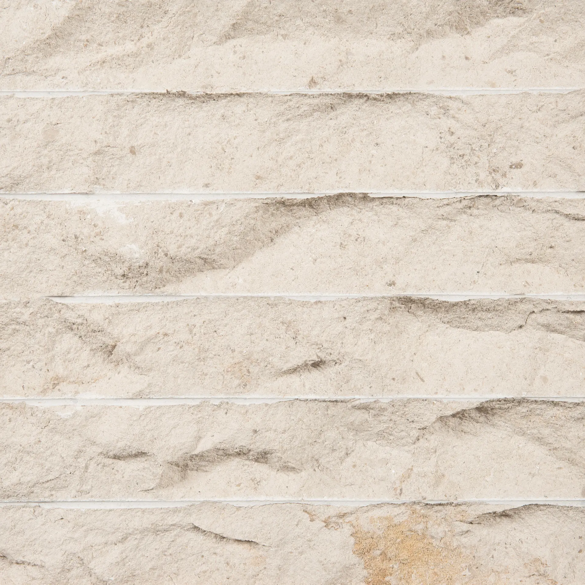 Calcário cinzento-azulado com pequenas manchas dispersas de tonalidade mais clara e elementos grosseiros, calciclástico e pouco bioclástico